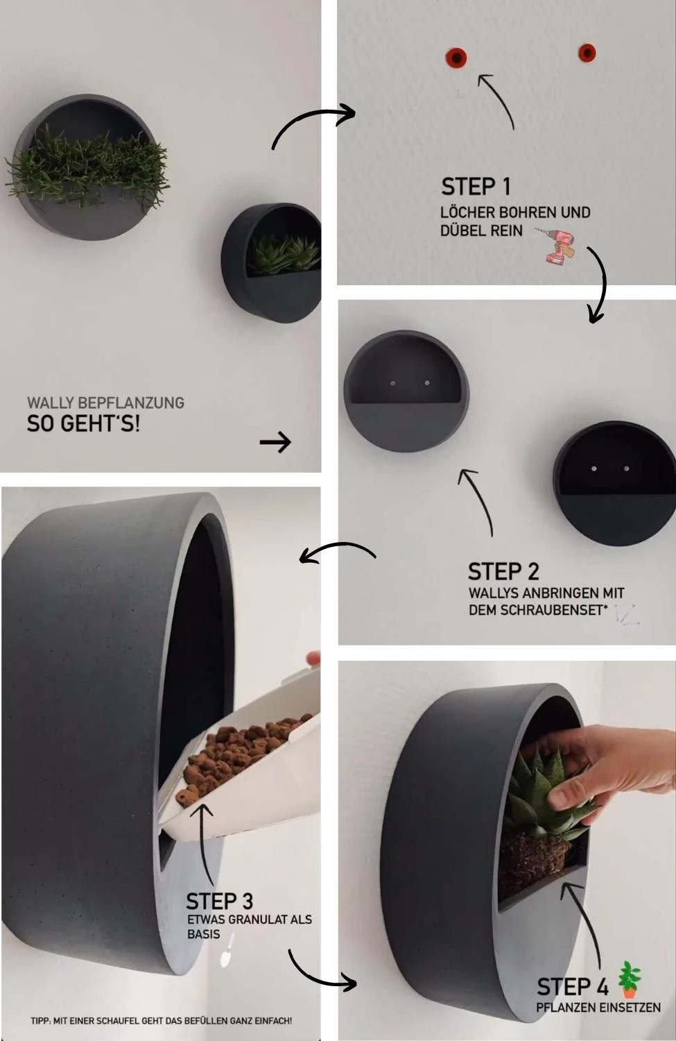 Dank der mitgelieferten Schrauben und Dübel lassen sich die Wallys mühelos an jeder Wand befestigen. Ob einzeln oder in Kombination: Die Wally Pflanzschalen sind in verschiedenen Größen, Farben und Formen erhältlich und bieten dir unendliche Gestaltungsmöglichkeiten. Ideal für modernes Urban Gardening!