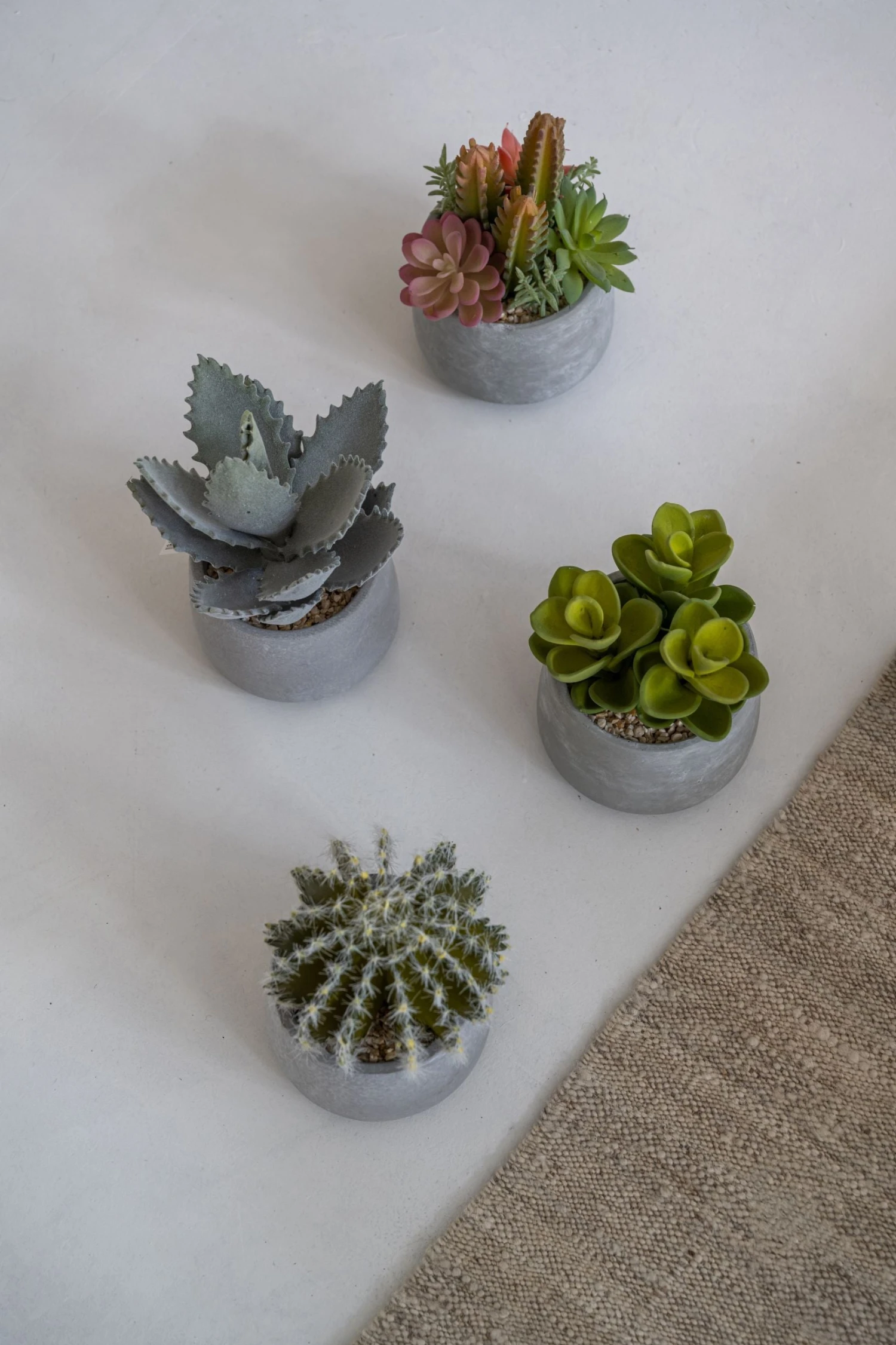 Sukkulente künstlich im Zementtopf als Set für eine einfache hochwertige Dekoration.